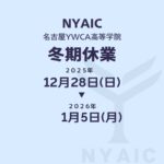名古屋YWCA高等学院国際コース NYAICは、下記の期間お休みさせていただきます。どうぞよろしくお願いいたします。 ◆夏期休業期間:2025 年12月28日(日)~2026年1月5日(月) 上記期間中、入学等のお問合せ…