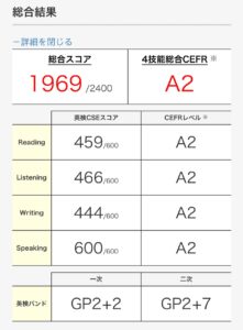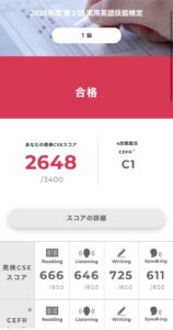 自分で行った試験対策としては、作文の書き方の本を買って練習したり、ライティング部分は得点が高いので、しっかり描けるように、要約文を25分、作文を30分で書き、その他の部分を35分で解く練習をしました。試験の時も要約文、作文からやり始めました。
