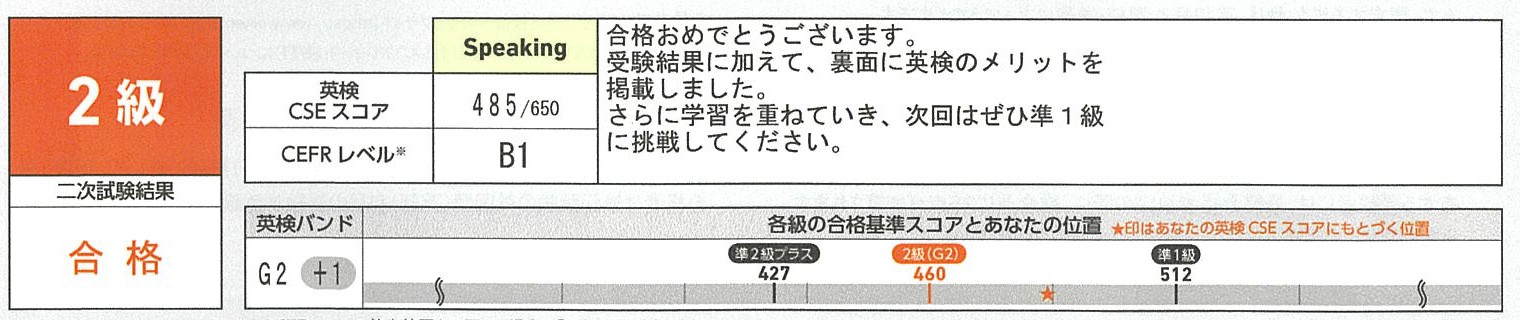 一次試験は何度も受験してるので、落ち着いて受験できました。二次試験は、練習は完璧ではありませんでしたが、たくさん練習したことで、落ち着いてスピーチができました。